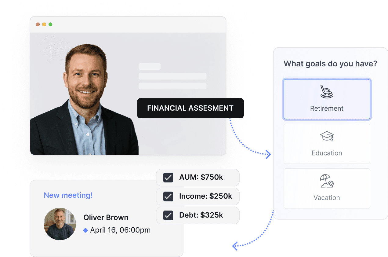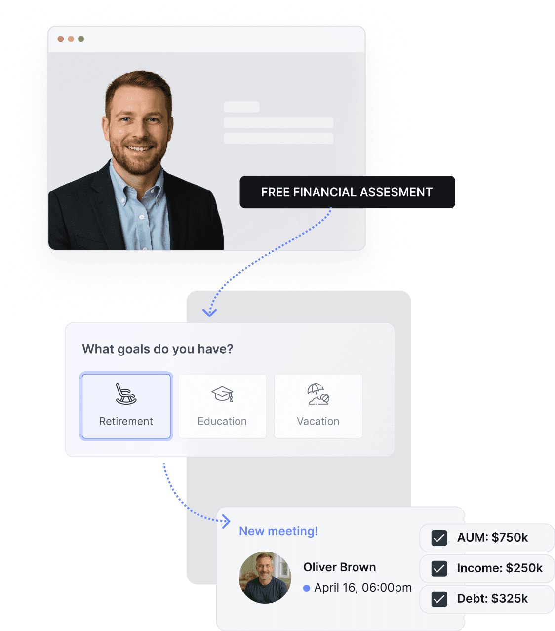 Embed our Financial Health questionnaire anywhere—website, email, or social media. Leads qualify themselves and book directly into your calendar.